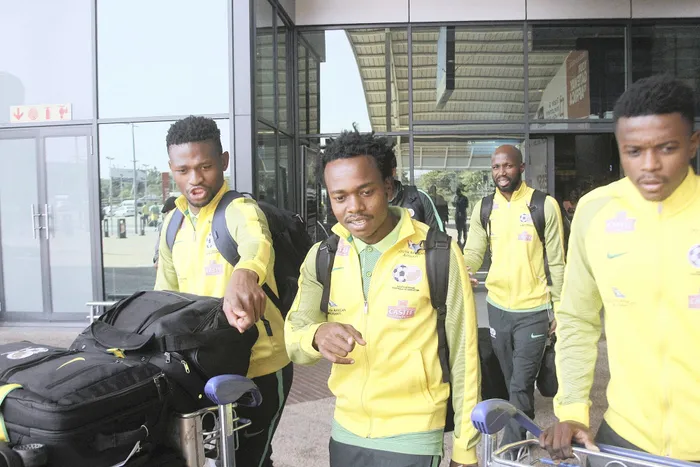 ABADLALI beBafana Bafana uMotjeka Madisha, Percy Tau noTeboho Mokoena ngesikhathi befika eThekwini izolo ABADLALI beBafana Bafana uMotjeka Madisha, Percy Tau noTeboho Mokoena ngesikhathi befika eThekwini izolo