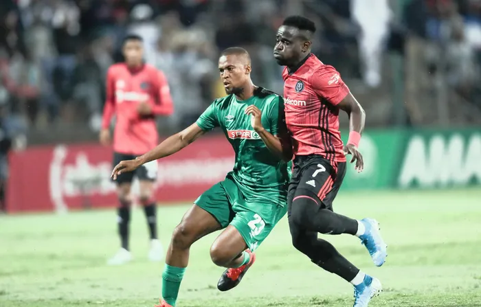 UMDLALI wasemuva waMaZulu uTshepo Gumede emakene nowe-Olrando Pirates uGabadinho Mhango emdlalweni we-Absa Premiership eKing Zwelithini Stadium, eMlaza, izolo ebusuku Isithombe: BACKPAGEPIX UMDLALI wasemuva waMaZulu uTshepo Gumede emakene nowe-Olrando Pirates uGabadinho Mhango emdlalweni we-Absa Premiership eKing Zwelithini Stadium, eMlaza, izolo ebusuku Isithombe: BACKPAGEPIX
