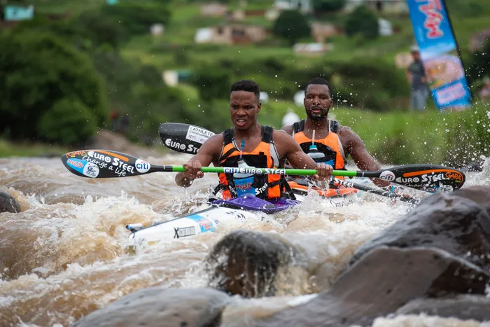 UNQOBILE Makhanya (ongaphambili) owathathwa egwedlwa noSbonelo Khwela kwiDusi Canoe Marathon nyakenye belala isithathu kulo mjaho wokugwedla izikebhe onedumela eNingizimu Afrika ozoqala ngoLwesine usongwe ngoMgqibelo Isithombe: GAMEPLAN MEDIA