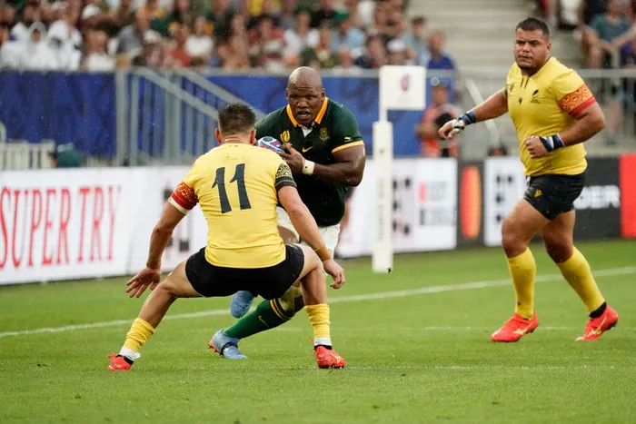 UMBONGENI Mbonambi wamaBhokobhoko ngesikhathi efuna indlela kuNicolas Onutu weRomania emdlalweni kaPool B, eStade de Bordeaux, eFrance Isithombe: DAVID WINTER/BACKPAGEPIX