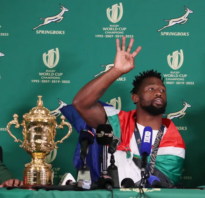 USIYA Kolisi ukaputeni weqembu lesizwe lebhola lombhoxo esilinqobe isicoco seNdebe yoMhlaba amahlandla amane Isithombe: BACKPAGEPIX