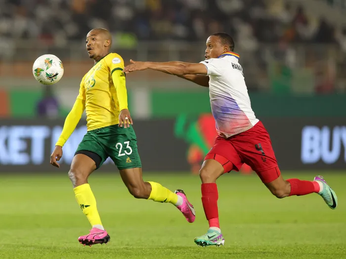 UTHAPELO Morena weNingizimu Afrika ezama ukugqashula kuRiaan Hanamub weNamibia ngesikhathi la mazwe aqhamuka kwiCosafa egadulisana esigabeni samaqoqo kwi-Africa Cup of Nations Isithombe:BACKPAGEPIX