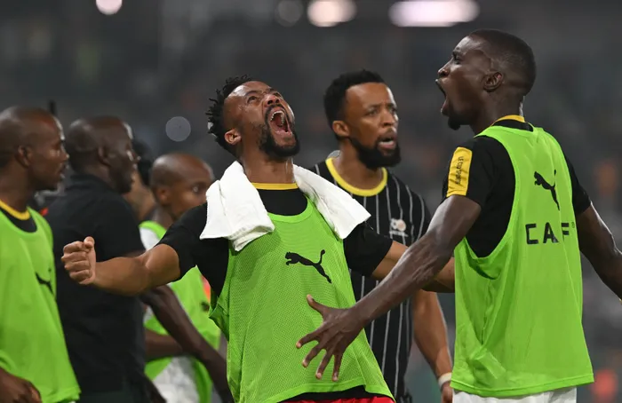 UVELI Mothwa (ogaxe ithawula) uzakhele ugazi kubalandeli beBafana Bafana ngokweseka ozakwabo ngesikhathi beyibambe kwi-Africa Cup of Nations njengoba ebonakala lapha ejabulela, uRonwen Williams, evimbe enye yamaphenathi bedlala neCape Verde Isithombe: BACKPAGEPIX