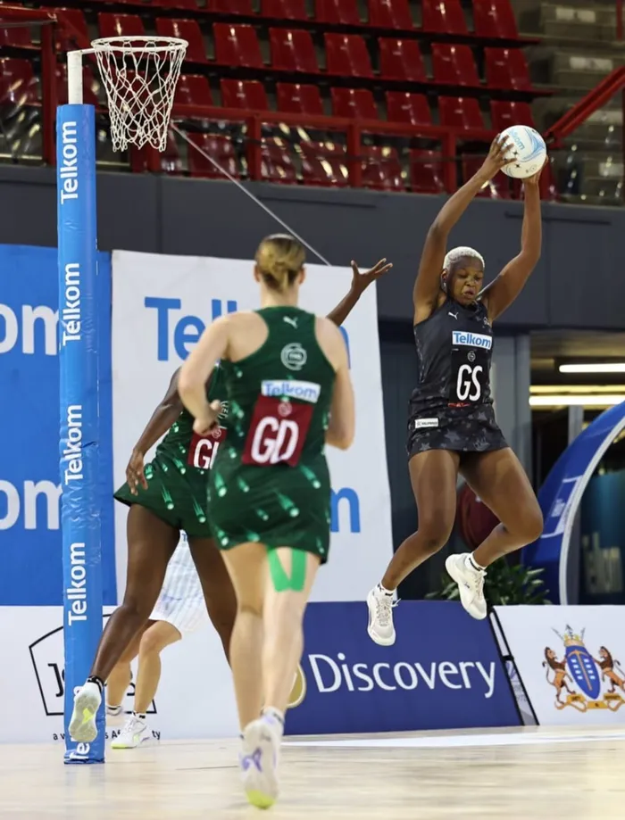 UMGADLI weKingdom Stars, u-Aphiwe Thusini, enqaka ibhola emdlalweni weTelkom Netball League ne-Eastern Cape Comets Isithombe: NETBALL/X
