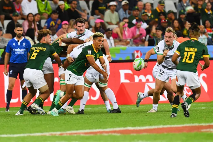 IQEBU lesizwe lakuleli lebhola lombhoxo leSevens kugcine kulilungele lazibekisela indawo kuma-Olympic aseParis, eFrance ngenyanga ezayo. Lapha lathathwa lidlala koweWorld Rugby Sevens Series nyakenye eKapa Isithombe: AFP