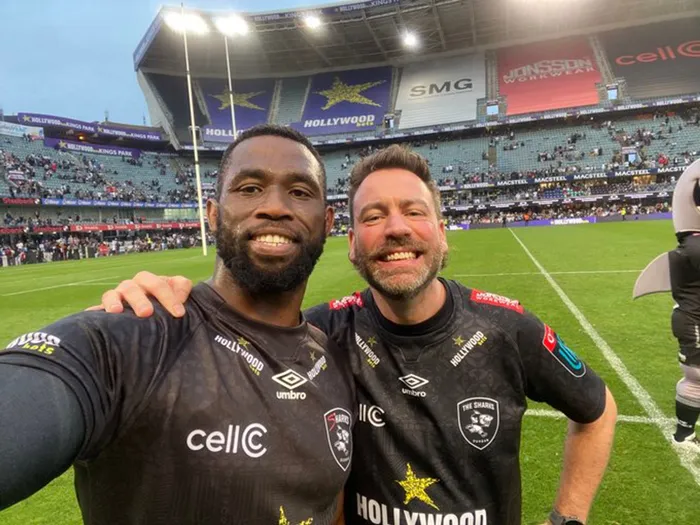 Umdlali wamaSharks uSiya Kolisi nosomahlaya uRory Petzer ngemuva komdlalo we-URC neMunster ngoMgqibelo Isithombe: X/The Sharks