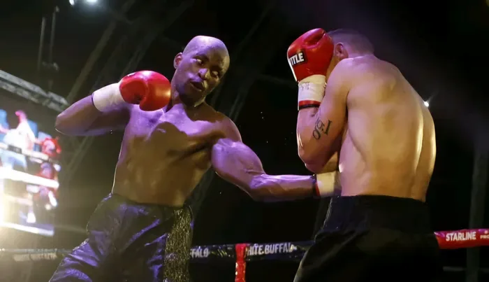 UPHUMELELE Ngcobo (okwesokunxele) ozolwa noThabiso Mthembu empini yebhande le-KZN Welterweight Isithombe: SITHUNYELWE