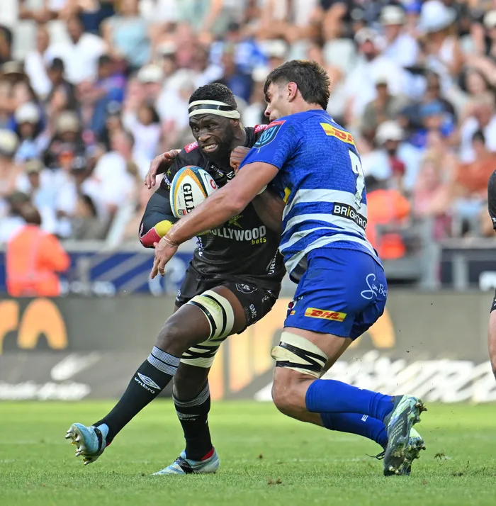 UMDLALI weHollywoodbets Sharks, uSiya Kolisi, edudulana noweDHL Stormers, uBen Jason Dixon, ngesikhathi la maqembu ebhekene kwi-United Rugby Championship eKapa, ngoMgqibelo Isithombe: BACKPAGEPIX