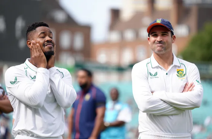 UKHAYA Zondo umdlali wamaProteas nokaputeni wawo uDean Elgar ngemuva kokwehlulwa i-England kwi-test yesithathu e-Oval, eLondon ngoMsombuluko Isithombe: BACKPAGEPIX