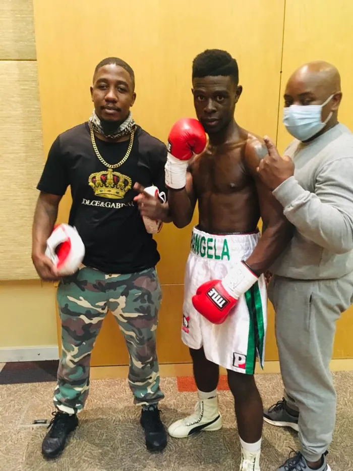 USIYABONGA Mpangele (ophakathi) oqoleke ejimini emasontweni edlule. Lapha wathathwa enomqeqeshi wakhe uSizwe Mthembu noZwilenkosi Magudulela weLudonga Boxing Promotions Isithombe: SITHUNYELWE