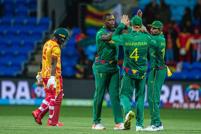 ABADLALI bamaProteas bejabulela ukuthatha iwikhethi ngesikhathi bedlala neZimbabwe koweT20 kwiNdebe yoMhlaba ebanjelwe e-Australia Isithombe: EPA