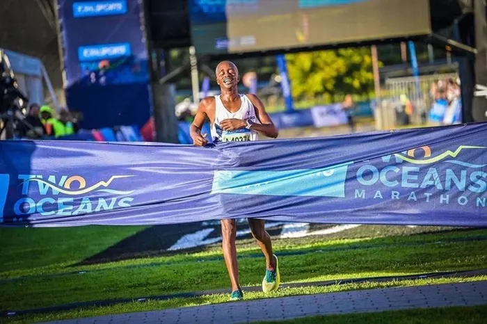 UMPETHA weTwo Oceans Marathon wanonyaka uGivemore Mudzinganyama eshaya intambo lapho bekuphelela khona umjaho e-University of CapeTown izolo ekuseni Isithombe: Givemore Face Page