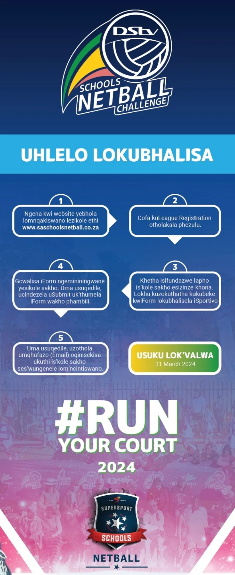 KUGQUQGUZELWA izikole zasemakhaya ukuthi ziphuthume zibhalisele ukuba yingxenye yomqhudelwano, iDStv Schools Netball Challenge Under 19 (DSNC), umdlalo wawo wamanqamu kazwelonke ongoJulayi 12-13, eFlorida High School, eGoli.