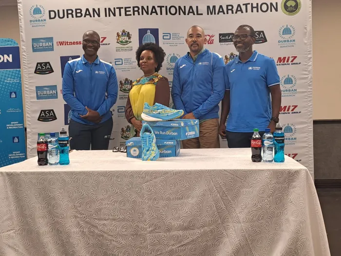 KUNGESIKHATHI kwethulwa izinhlelo zalo nyaka zeDurban International Marathon, izolo, eThekwini. Kwesokunxele uSteve Mkasi, Thobile Sifunda woMnyango wezeMidlalo nabahleli balo mjaho, uLee-Roy Newton noSihle ShangeIsithombe: SITHUNYELWE