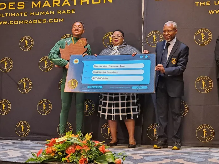 UDAN Moselakwe (kwesokunxele) ophume endaweni yesibili kwiComrades Marathon ngeSonto, ebongelwa yisikhulu saMasipala weTheku, noMqondisi Ngcobo weComrades Marathon Association Isithombe: SITHEMBISO MKHIZE