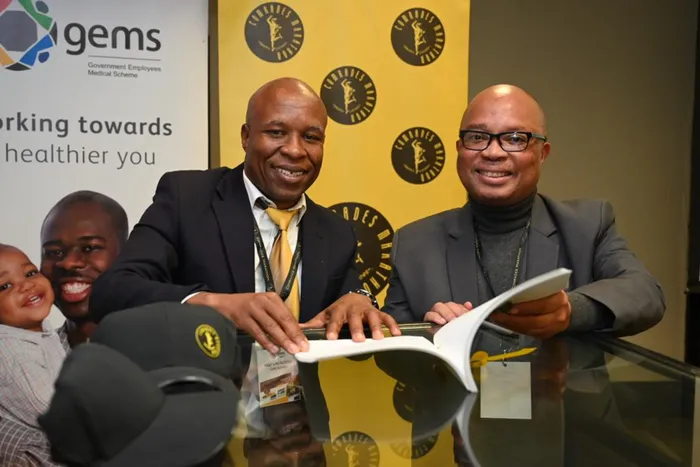 USIHLALO webhodi yeComrades Marathon Association, uMqondisi Ngcobo (kwesokunxele) noPhumelela Dlomo wenkampani iGems engabaxhasi bomjaho iComrades Marathon Isithombe:COMRADES