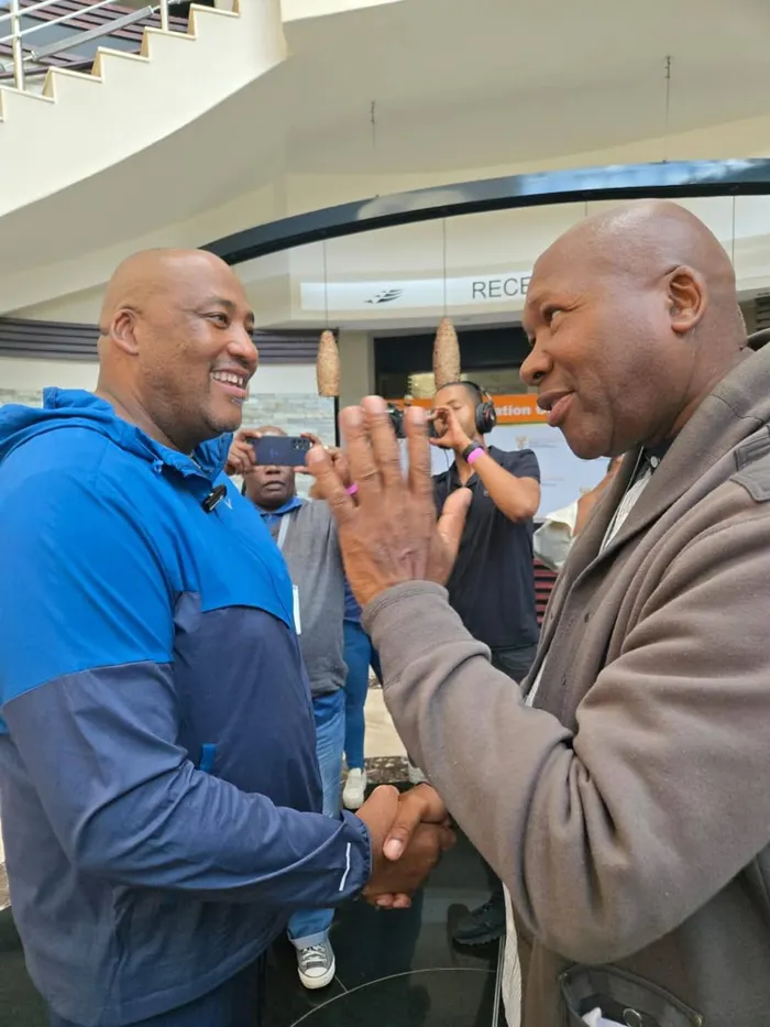 UGAYTON McKenzie (okwesokunxele) ongungqongqoshe wezeMidlalo, ubuCiko namaSiko encokola nowayeyisikhulu esiphezulu seBoxing South Africa (BSA), uLoyiso Mtya, ngaphambi kokuqala kwembizo yesibhakela iNational Boxing Convention e-East London, izolo Isithombe: ZAKHELE XABA