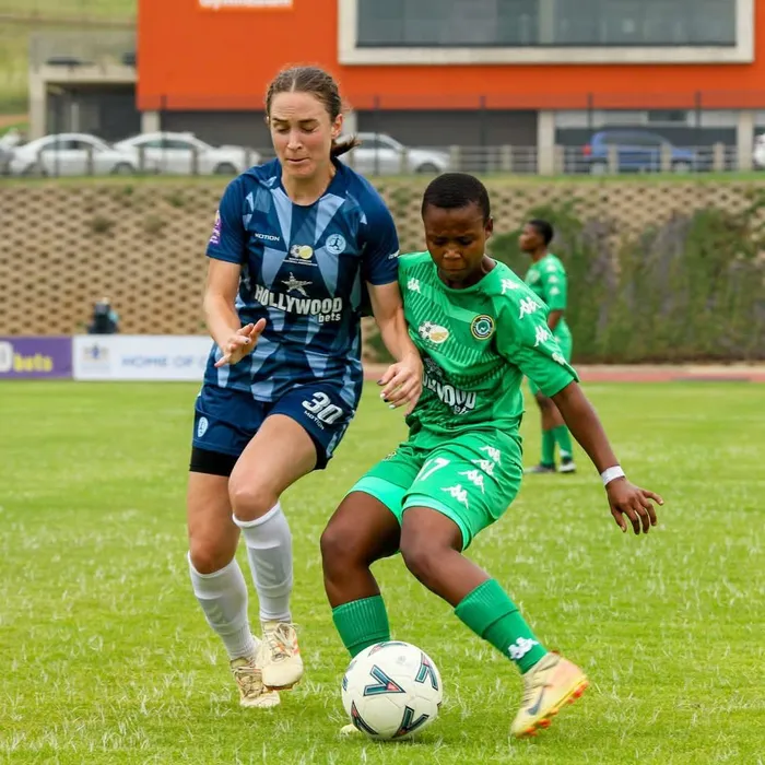 USIPHESIHLE Mvila we-Ezemvelo Women's FC (ophethe ibhola) owathathwa bebhekene ne-JVW, ungomunye wabadlali baleli qembu okubhekeke benze izinto zenzeke sebebhekene neMamelodi Sundowns Ladies ngoMgqibelo Isithombe: EZEMVELO FACEBOOK