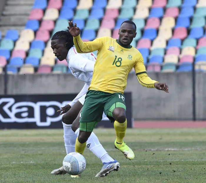 UKAMOGELO Sebelebele weBafana Bafana eshikilisana noJoseph Francois weMauritius koweHollywoodbets Cosafa Cup, eDr Molemela Stadium, eBloemfontein