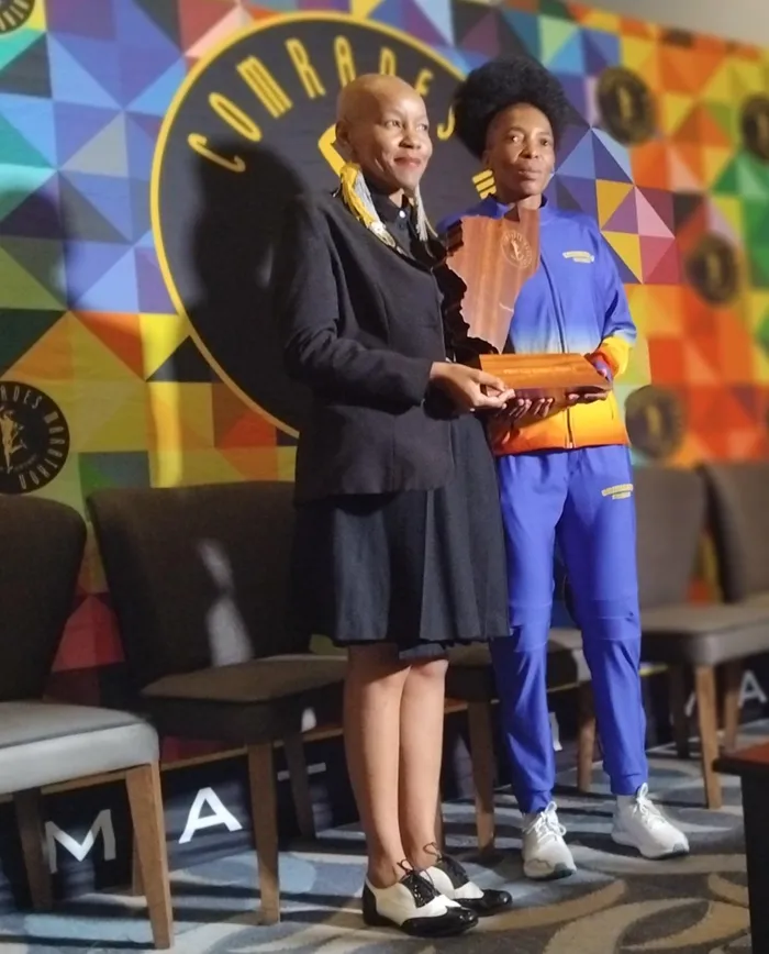 UJENET Mbhele emukela umklomelo wakhe kuNontuthuko Mashimane weComrades Marathon Association emcimbini wokuklonyeliswa kwabagijimi