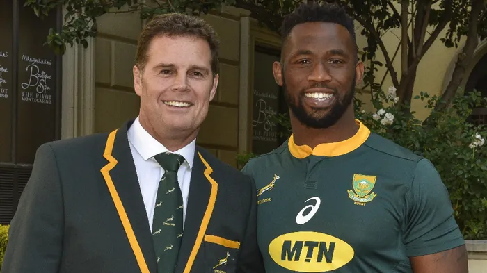 UMQEQESHI wamaBhokobhoko uRassie Erasmus nokaputeni uSiya Kolisi ngaphambi komdlalo wakhe wokuqala ehola leli qembu ngo-2018