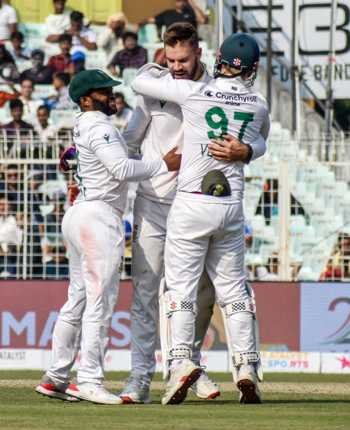 UKAPUTENI wamaProteas, uTemba Bavuma, ejabula nozakwabo u-Aiden Markram noKyle Verreyne ngesikhathi benqoba i-India.