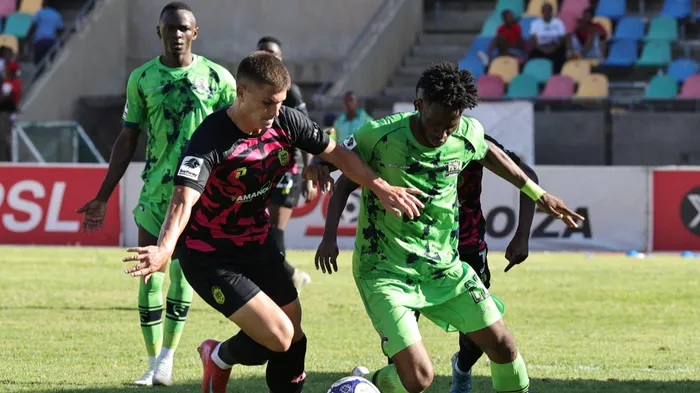 ISITOBHA saMaZulu, uKeagan Allen, sibanga ibhola noRomaric Outtara weMarumo Gallants emdlalweni weBetway Premiership eDr Molemela Stadium eBloemfontein, ngoMgqibelo ntambama