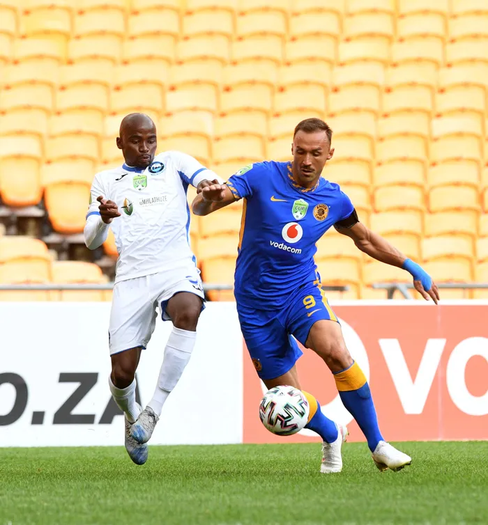 UMGADLI weKaizer Chiefs uSamir Nurkovic ebhinciswe uTshepo Mabua weRichards Bay, emdlalweni weNedbank Cup Last 32 onqotshwe yiNatal Rich Boyz, eFNB Stadium Soweto izolo ntambama. Isithombe: Sydney Mahlangu/BackpagePix