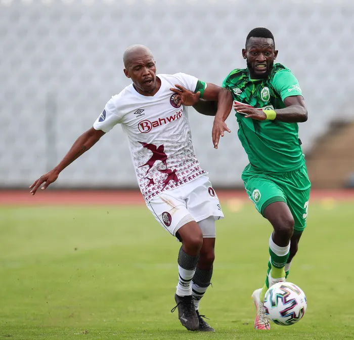 U-AUGUSTINE Mulenga waMaZulu FC (kwesokudla) emiswe kabi uLebohang Mokoena weSwallows ngesikhathi la maqembu etholene phezulu koweDStv Premiership eDobsonville Stadium izolo ntambama. Isithombe: Muzi Ntombela/BackpagePix