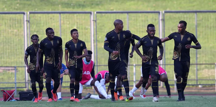 Victor Letsoalo of Royal AM celebrates goal with teammates during the DStv Premiership 2021/22 match between Royal AM and Chippa United on the 12 September 2021 at the Chatsworth Stadium, Chatsworth ©Muzi Ntombela/BackpagePix