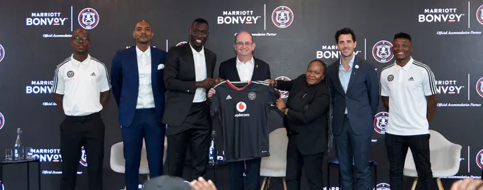 UNKOSINATHI Sibisi, umdlali we-Orlando Pirates, uPhumudzo Manenzhe inxusa leMarriott Bonvoy, unozinti, uRichard Ofori, uSean Maher weMarriott Bonvoy, uThandi Merafe wezokuxhumana kweZimnyama, uJohn Clayman weMarriott Bonvoy nomdlali uThabiso Monyane ngesikhathi kwethulwa lobu budlelwano ngoLwesibili Isithombe: BACKPAGEPIX