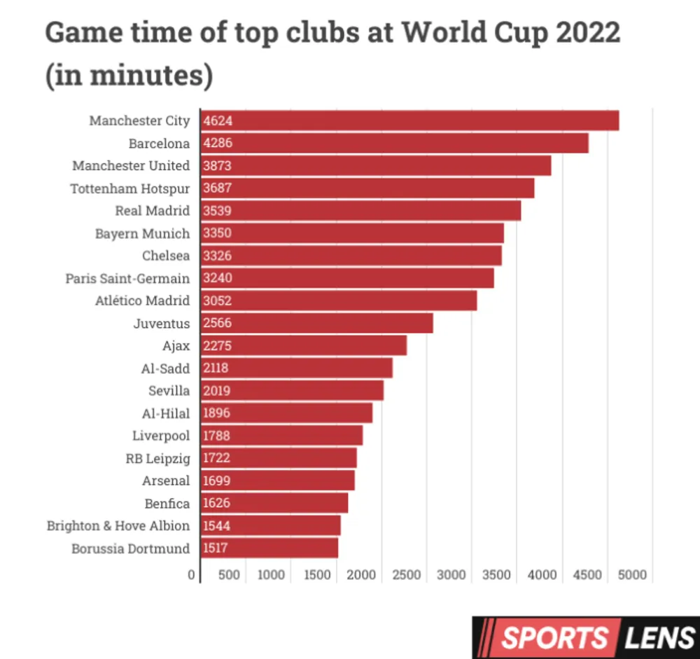 I-Barcelona ibihamba phambili ngesibalo sabadlali ngemuva kokuthumela abangu-17 eNdebeni yoMhlaba, ilandelwe yiManchester City neBayern Munich, abebenabadlali abangu-15 eQatar.