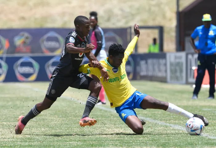 UTHANDO Buthelezi weMamelodi Sundowns exinwe wuSeun Moremi we-Orlando Pirates emdlaweni weDStv Diski Challenge, eGiant Stadium, eTshwane, ngoMgqibelo Isithombe: BACKPAGEPIX