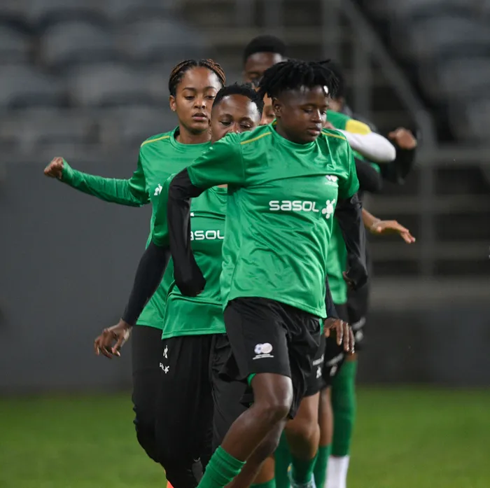 ULEBOGANG Ramalepe, isethenjwa sesitobha seBanyana Banyana, ngomunye wabadlali umqeqeshi wabo, uDesiree Ellis acacisa ngokusala kwabo esikwatini esiya kwiTurkish Women’s Cup Isithombe: BACKPAGEPIX