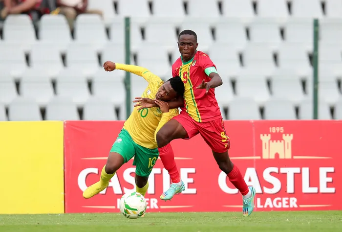 UMDUDUZI Shabalala weNingizimu Afrika ezama ukudlula kuDavarel Diambomba Mouandza weCongo Brazzaville ngesikhathi la mazwe etholene kowomlenze wokuqala wokuhlungela i-Africa Cup of Nation ka-Under 23, obudlalelwa eDobsonville Stadium ngoLwesine ntambama Isithombe: BACKPAGEPIX