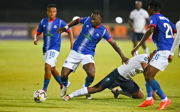 UMGADLI weMaritzburg United, u-Amadou Soukouna (odlubulundelayo), ngomunye wabadlali abamqoka eqenjini kanti lithembe bona empini yokuvika izembe kwiDStv Premiership Isithombe: BACKPAGEPIX