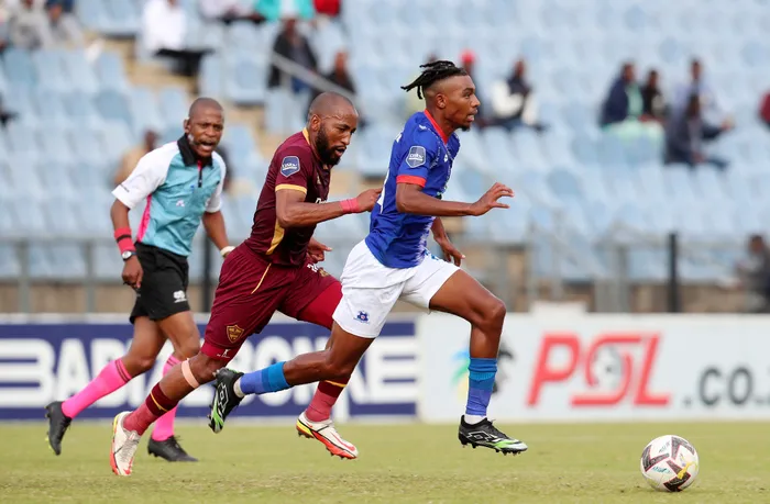 UMDLALI weMaritzburg United uGenino Palace egadulisa uSibongiseni Mthethwa weStellenbosch FC emdlalweni onqotshwe yiThe Team of Choice eHarry Gwala Stadium eMgungundlovu izolo ntambama Isithombe: BACKPAGEIX