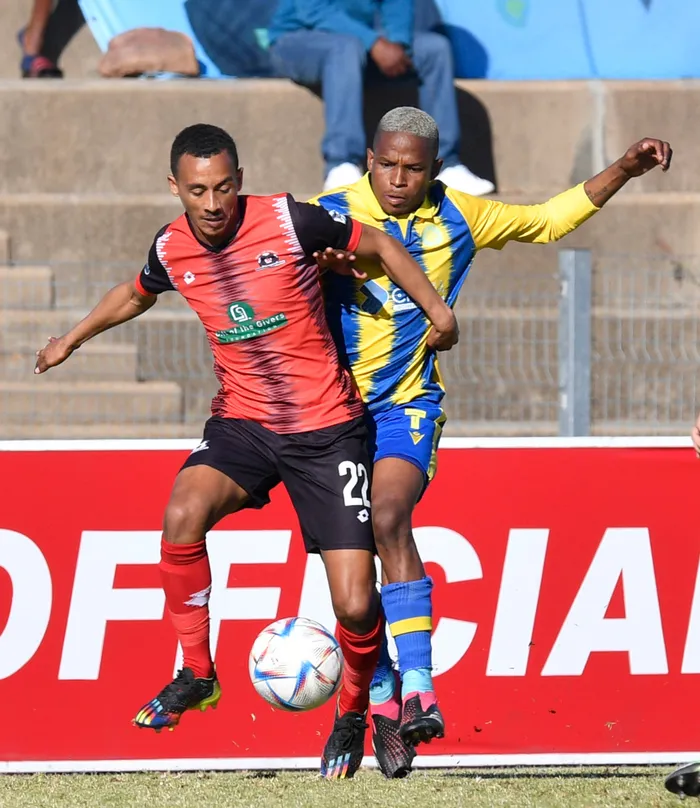 UBRANDON Theron weMaritzburg United eshikilisana noLehlogonolo Mojela weCasric Stars emdlalweni wamaPSL Promotion Play-Offs, eSolomon Mahlangu Stadium, KwaMhlanga, ngoMgqibelo ntambama Isithombe: BACKPAGEPIX