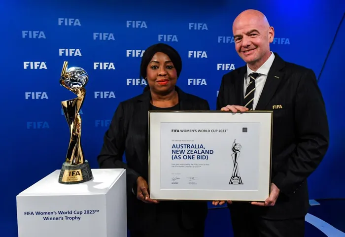 UNOBHALA jikelele weFifa uFatma Samoura nomengameli wale nhlangano uGianni Infantino ngesikhathi kuqokwa i-Australia neNew Zealand njengamazwe azosingatha iNdebe yoMhlaba yebhola labesifazane eqala namuhla Isithombe: FIFA/TWITTER