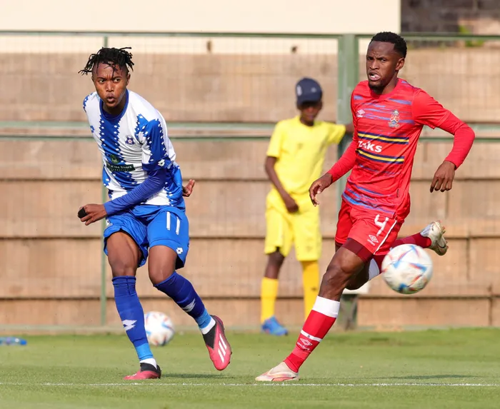 U-ANDISWA Sithole weMaritzburg United (wejezi elimhlophe nokuluhlaza) oxinwe wuSikhosonke Langa we-University of Pretoria, ungomunye wabadlali abathembisayo kuleli qembu laseMgungundlovu elizimisele ngokudla isicoco seMotsepe Foundation Championship Isithombe: BACKPAGEPIX