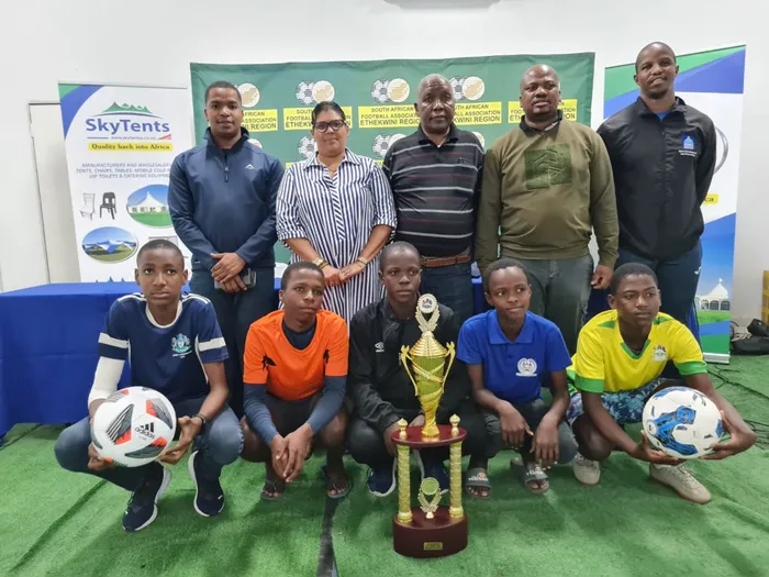 OKAPUTENI bamaqembu azodlana imilala emidlalweni yokusongwa komqhudelwano, iSky Tents Champions League U-15, bephahlwe yizikhulu okubalwa umengameli weSafa eThekwini, uMazwi Mkhize, abaxhasi bomqhudelwano, ubuholi beKZN Sports noMasipala waseThekwini Isithombe: SITHUNYELWE