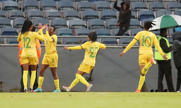 UTHEMBI Kgatlana ejabula nozakwabo ngemuva kokushaya igoli lakhe lesibili bedlala neDRC kowokuhlungela ama-Olympic e-Orlando Stadium, ngoMsombuluko ntambama Isithombe: BACKPAGEPIX