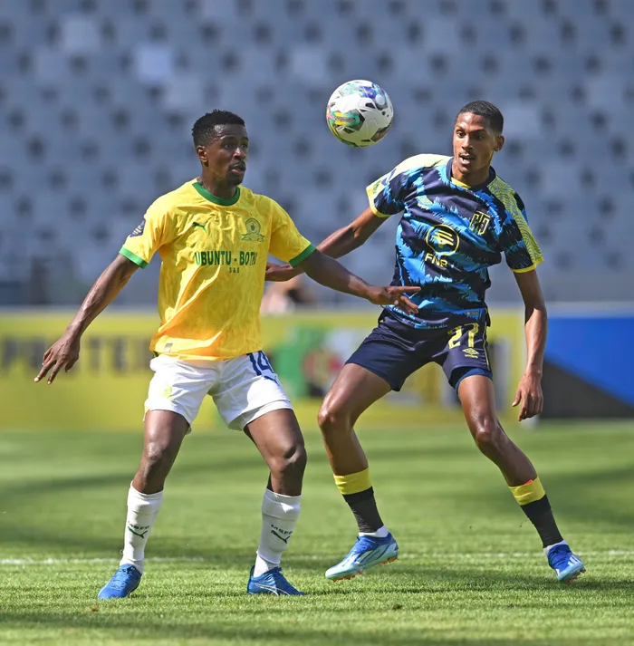 UTERRENCE Mashego weMamelodi Sundowns exine uTaahir Goedeman weCape Town City ngesikhathi la maqembu ebhekene emdlalweni weDStv Premiership, eDHL Cape Town Stadium ngeSonto ntambama Isithombe: BACKPAGEPIX