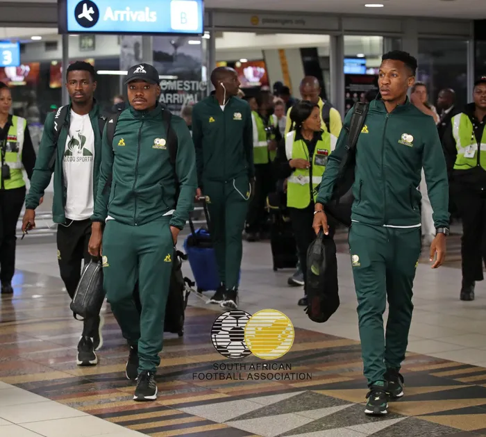 UMDLALI weBafana Bafana, uPercy Tau nozakwabo uThemba Zwane ngesikhathi befika e-OR Tambo International, eGoli njengoba bezodlala owobungani neLesotho namuhla ngaphambi kokuya kwi-Afcon, e-Ivory Coast Isithombe: SAFA/TWITTER