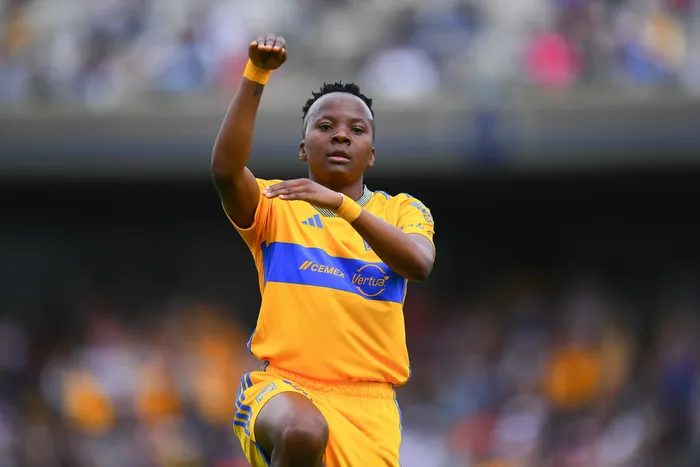 UMGADLI weBanyana uThembi Kgatlana ejabulela elinye lamagoli amabili awashayele iqembu lakhe iTigres UANL eMexico Isithombe: TIGRES UANL FEMENIL/TWITTER
