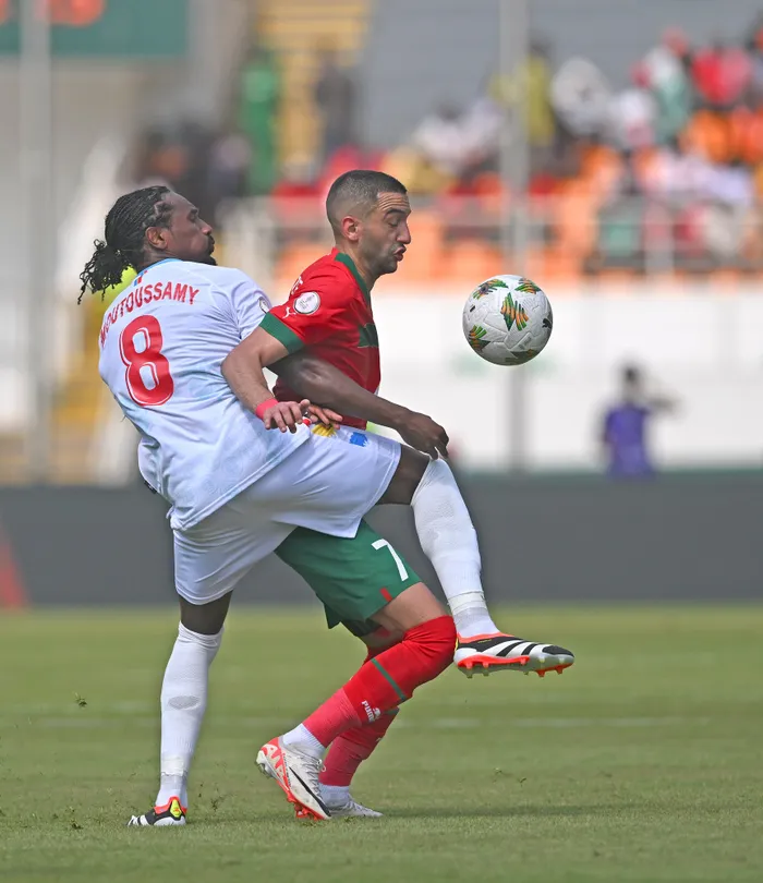 BEZIGUDLANA kanje phakathi kukaHakim Ziyech weMorocco noSamuel Alain Moutoussamy weDemocratic Republic of Congo emdlalweni wesibili kaGroup F we-Africa Cup of Nations ophele zibambene ePokou Stadium, eSan Pedro, e-Ivory Coast Cote ngeSonto ntambama Isithombe:BACKPAGEPIX