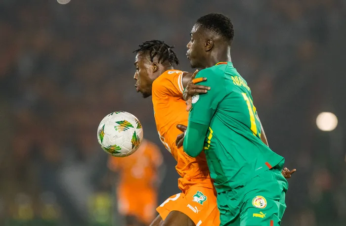 BEZISHUKANA kanje phakathi kukaKouakou Kouame Christian we-Ivory Coast noMoussa Niakhate weSenegal emdlalweni we-Last 16 ye-Afcon ogcine unqotshwe yi-Elephants sekushaywa amaphenathi Isithombe:BACKPAGEPIX
