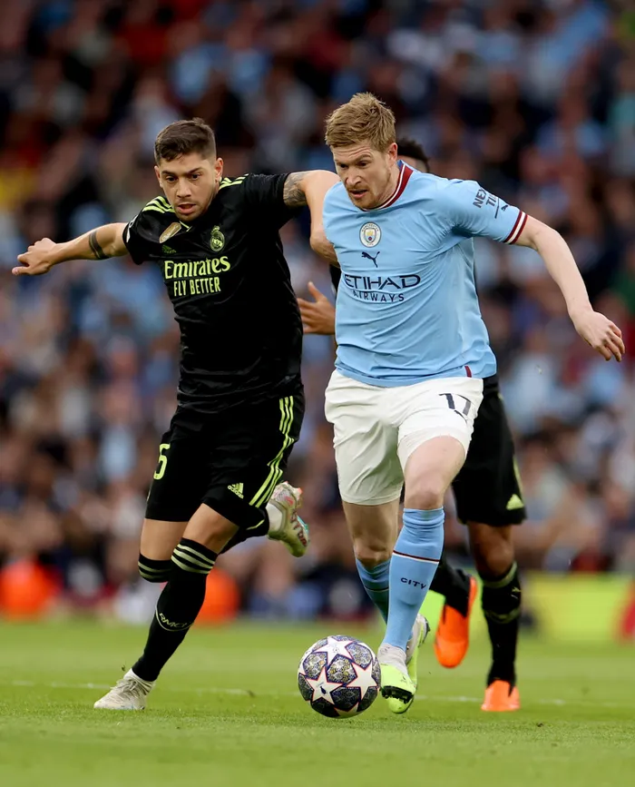 UKEVIN De Bruyne weManchester City noFrederico Valverde weReal Madrid, kubhekeke ukuba baphinde bashikilisane kanje emdlalweni wama-quarterfinal e-Uefa Champions League womlenze wokuqala, eSantiago Bernabeu, eMadrid, ngoLwesibili ebusuku Isithombe: EPA