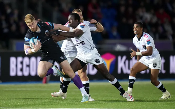 UGRANT Williams wamaSharks ezama ukuvimba uKyle Steyn weGlasgow Warriors ngesikhathi la maqembu etholene kowamaqoqo we-URC, Scoustoun Stadium, eGlasgow ngempelasonto: SHUTTERSTOCK