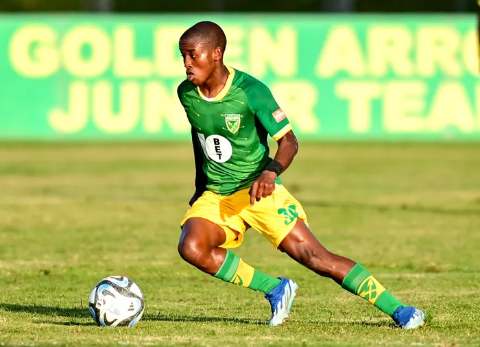 ISIKHWISHIKHWISHI somdlali weLamontville Golden Arrows, uSiyanda Mthanti, okhuthazwa ngumqeqeshi waleli qembu uSteve Komphela, ngohlobo lwebhola alidlalayo Isithombe: BACKPAGEPIX